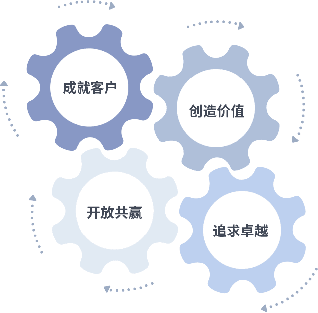 成就客户是一切决策的出发点,,创造价值是衡量所有工作的标准,,追求卓越是我们做事做人的态度,,,开放共赢是我们的格局也是最终的结果。。。价值观的齿轮环环相扣,,推动着组织里的每个人不断向前。。。。