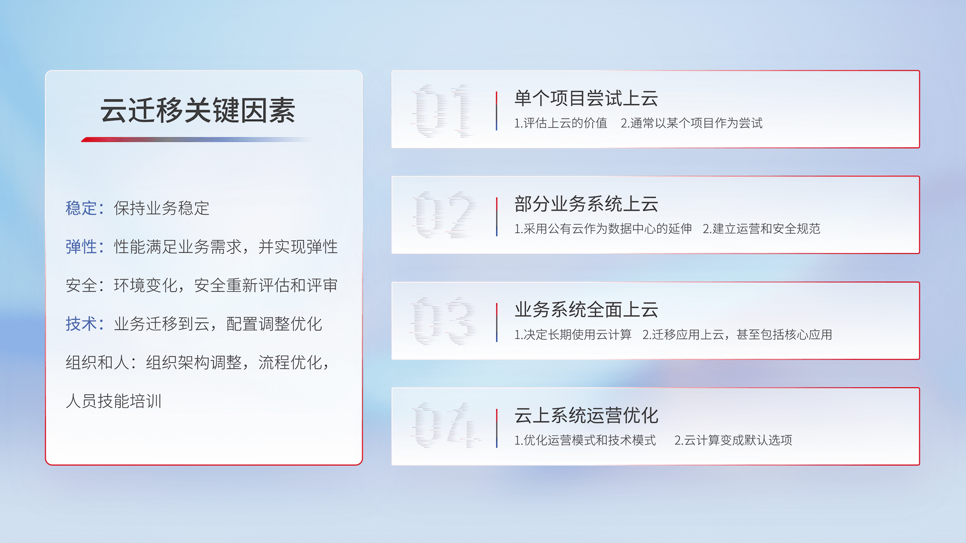 结合实际业务,,,,从规划设计、、、云平台选型、、云原生改造、、、、数据迁移、、集成交付,,迁移全过程为客户识别最佳上云路径,,,,做好风险识别管理,,设计网络架构、、、、身份权限、、、安全审计合规、、、、操作审计、、、日志审计、、、监控告警策略、、、、多站点容灾设计等,,,,对云上基础设施进行整体规划,,,提升IT治理水平,,,,以满足弹性、、、、高可用、、高性能的需求。。。。