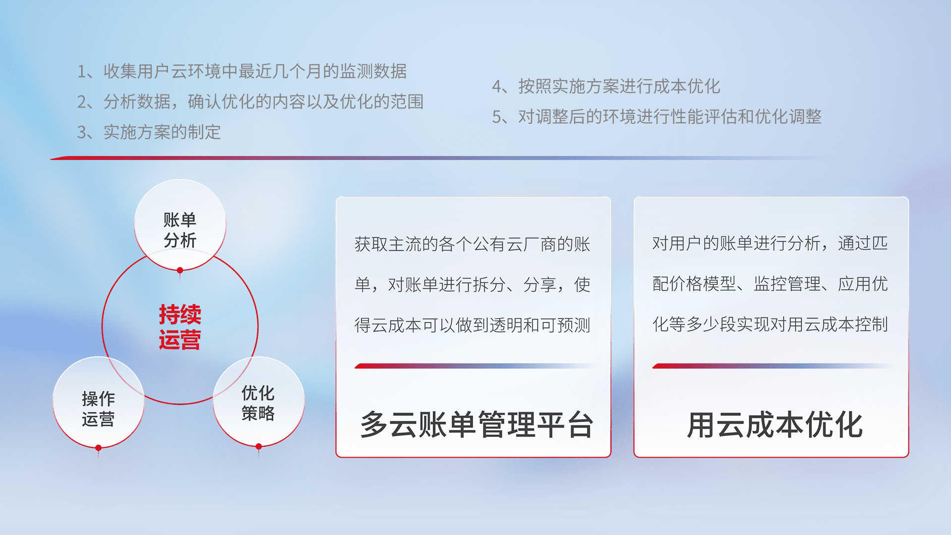 通过多云纳管,,,以统一的资源数据模型把客户的云资源进行抽象和封装,,进而实现对多云资源的统一操作,,,保障云资源管理的可靠性、、、稳定性与可用性。。。量身定制化运维内容,,配置、、开发运维、、、补丁管理、、备份、、、监控、、、认证和访问管理、、、审计和日常巡检等,,,,保障在用云过程中的可靠度,,,,稳定度以及高可用率。。。。